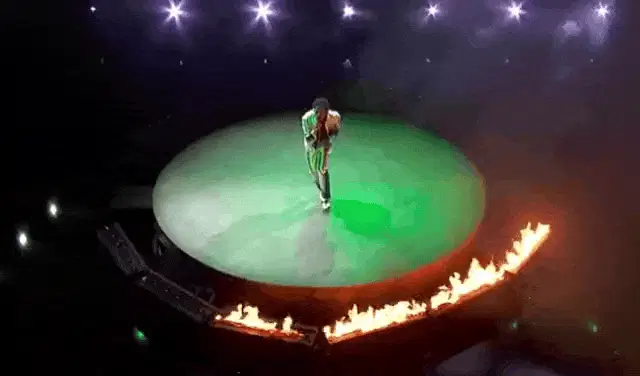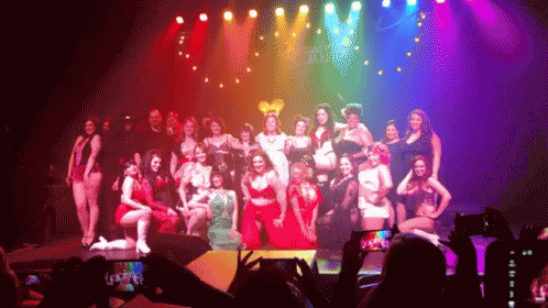 Rhinestone Cabaret performers pose on stage under vibrant lights, with audience members capturing the moment.