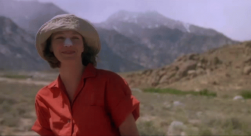 Rhonda Lebeck (Finn Carter) smiles and waves in a desert mountain landscape, also featuring Valentine, Val McKee, and Kevin Bacon.