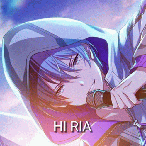 Blue-haired anime character Ria Toya Toyaria smiles and greets, with 'HI RIA' displayed on screen.