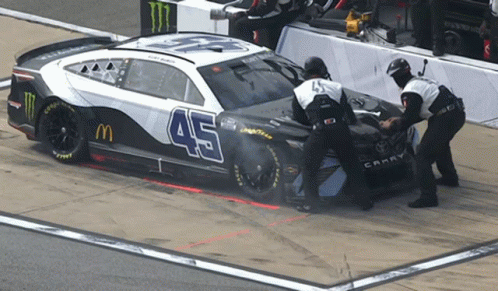 NASCAR car #45 experiences engine issues during a pit stop at the Richmond 2022 race, with crew working on the hood.