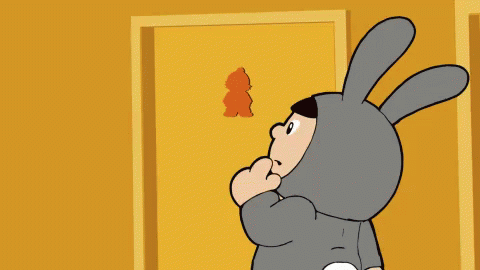 A Mainzelmännchen in a bunny costume decides between two restroom doors, one marked with a person, the other with a bunny.