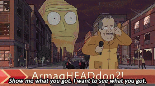 A giant head from Rick and Morty appears, causing destruction as a reporter says, 'Show me what you got. I want to see what you got.'