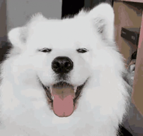 A happy white dog smiles at the camera, then unexpectedly transitions into a classic Rickroll.