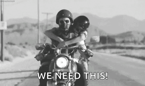 A couple shares a close hug while riding a motorcycle down a desert road, with the text 'WE NEED THIS!' displayed.