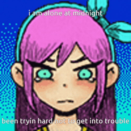 Cartoon girl with pink hair and green eyes, reflecting on being alone at midnight, trying to avoid trouble, inspired by Lana Del Ray's 'Ride'.