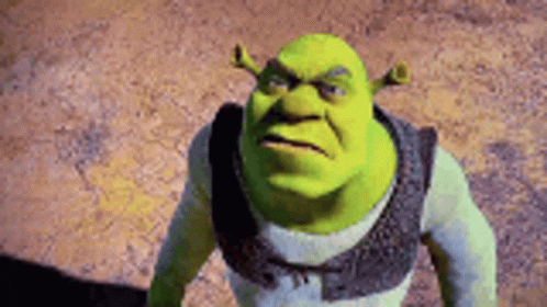 Shrek from the Shrek movies looks up with a confused and slightly annoyed expression in a barren landscape.