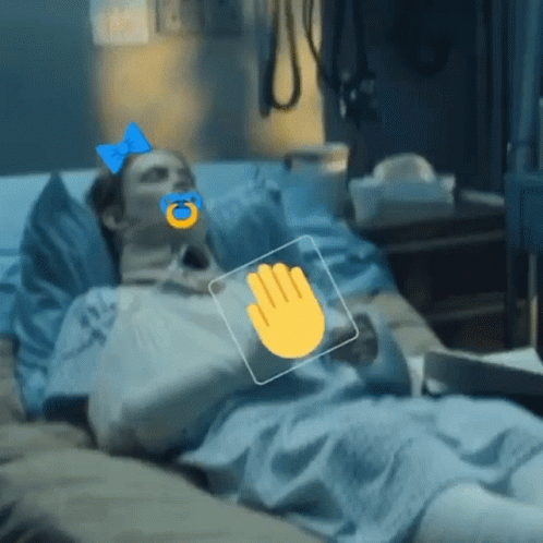 Ridewithp in a hospital bed, wearing a blue bow and using a pacifier.
