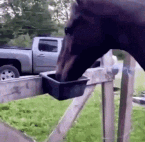 A brown horse drinks water from a trough attached to a wooden fence, with a pickup truck in the background.