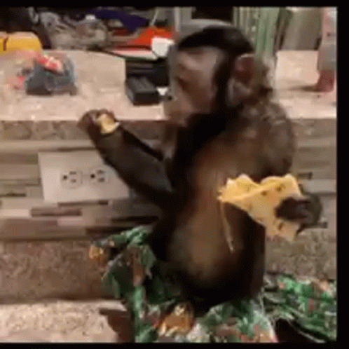 Ridewithp Lovelypeaches' monkey enjoys eating a piece of cheese while wearing a hula skirt.