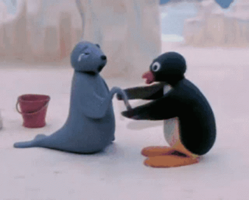 Pingu kneels to comfort a crying seal, holding its flippers in a heartwarming claymation scene.