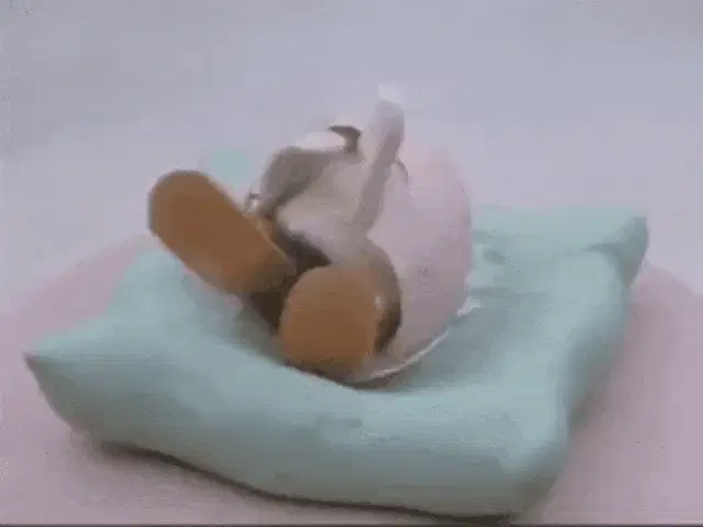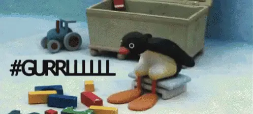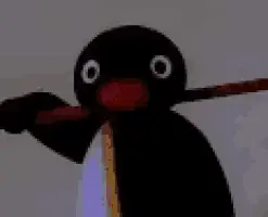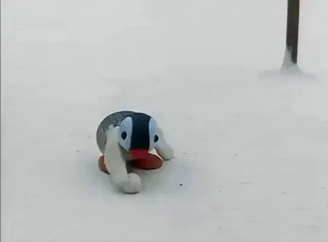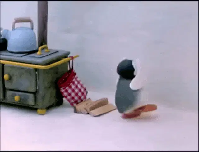 Pingu stands in an icy room, looking at a kettle on a stove, then sits down appearing sad.