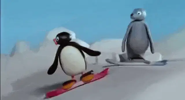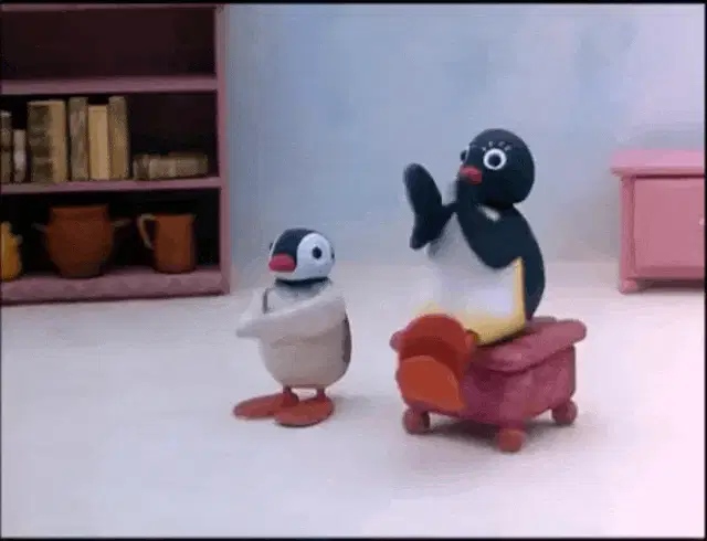 A Pingu plush toy wearing headphones sits beside a record player, ready to enjoy some tunes.