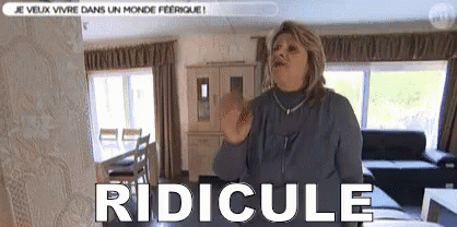 A woman stands in a living room, gesturing, with the French word 'RIDICULE' displayed prominently on screen.