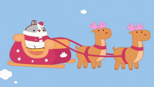 Molang, dressed as Santa, enjoys a festive Christmas sleigh ride pulled by two reindeer through a sparkling sky.