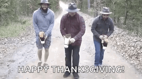Three men humorously 'ride' stick horses down a dirt road, wishing everyone a Happy Thanksgiving.