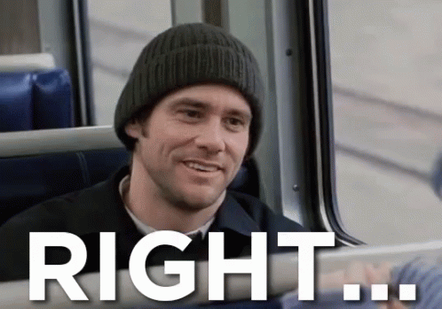 Jim Carrey, as Joel Barish, smiles subtly on a subway train with the word "RIGHT..." overlaid on screen.