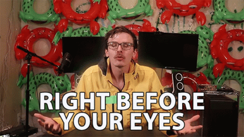 A man in a yellow jacket, idubbbz Tv, speaks into a microphone with the text "Right Before Your Eyes" displayed.