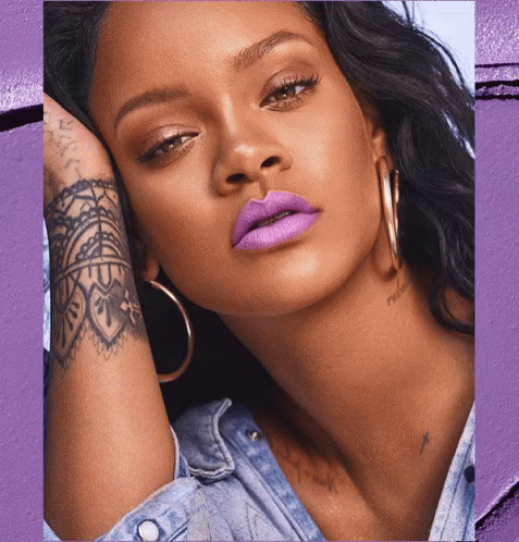 Rihanna Fenty showcasing a glamorous look with vibrant purple lipstick and gold hoop earrings.