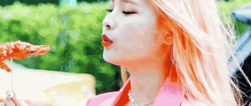 Weki Meki's Rina, with orange hair, playfully eats a shrimp on a stick while wearing a pink jacket.