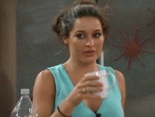 Elissa from Big Brother laughs uncontrollably and spits out her drink from a mug.