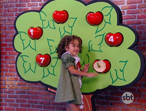 Maisa giggles playfully in front of a tree with numbered apples, enjoying a fun game.