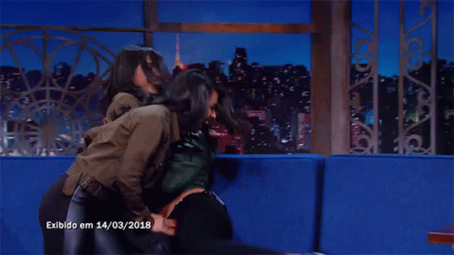 Three women burst into laughter on a blue couch during a segment of The Noite show, aired on March 14, 2018.