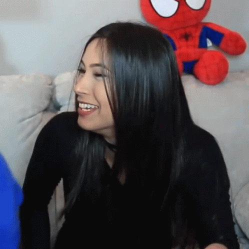 Sangerine bursts into contagious laughter while sitting on a couch next to a Spider-Man plush toy.