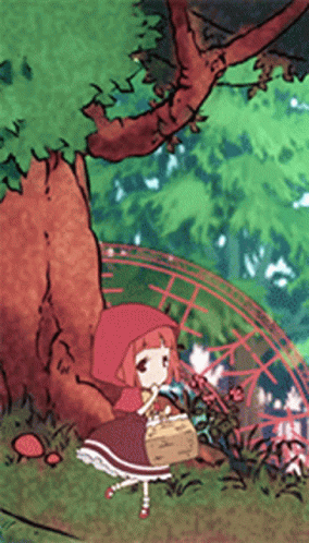 Ringo Akai from Okami San and Her Seven Companions stands by a tree, holding a basket.
