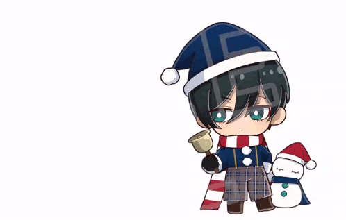 Chibi Itoshi Rin and Reo Mikage from Blue Lock in Christmas outfits, holding a bell and a gift bag with a snowman.