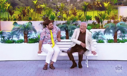 Carlos Alberto da Nóbrega and another man share a hearty laugh on a bench from A Praça É Nossa.