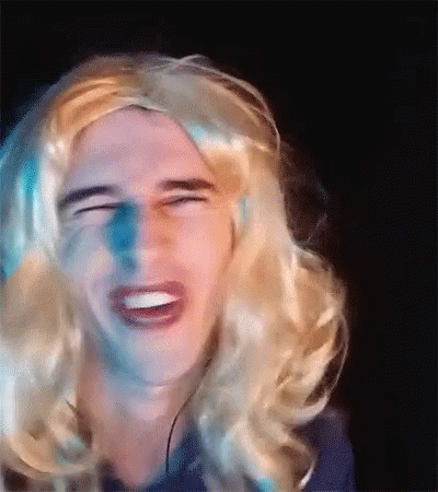 Maycon Sagaz in a blonde wig, laughing hysterically with a sarcastic and shy expression.