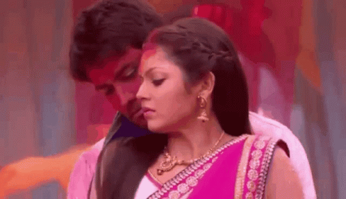 Rishabh and Drashti Dhami share a romantic embrace, holding hands in a colorful setting, showcasing their chemistry.