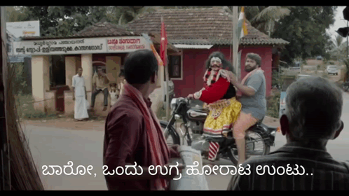 Rishabh Shetty in a Yakshagana costume on a motorcycle during a protest scene from Sarkari Hiriya Prathamika Shale.