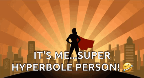 A cartoon superhero silhouette reveals itself as "Super Hyperbole Person" with a humorous caption.
