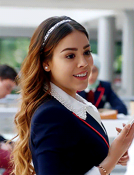 Danna Paola as Lucrecia from Elite, smiling and holding her cell phone.