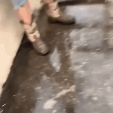 a person is walking on a wet floor in a room .