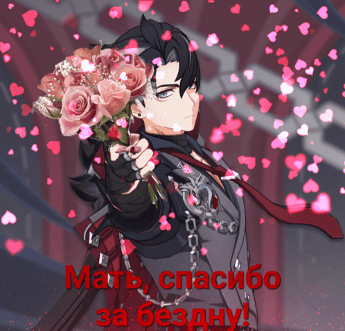 Rizzly from Genshin Impact holds a bouquet of pink roses, with the caption 'Mother, thank you for the abyss!'