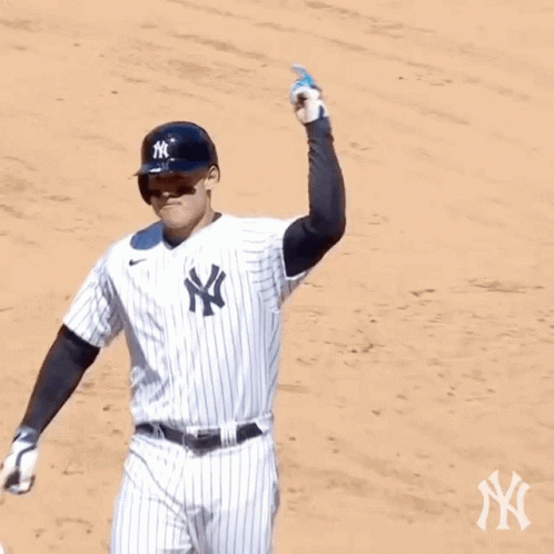 Anthony Rizzo celebrates in his New York Yankees uniform, pointing skyward on the baseball field.