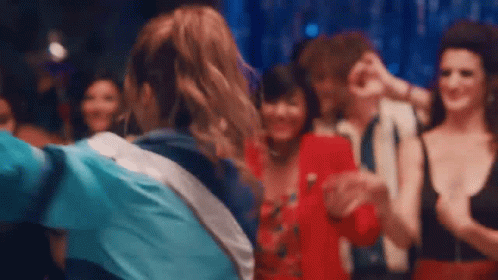 Nancy Ajram energetically dances at a lively party, surrounded by a joyful crowd.