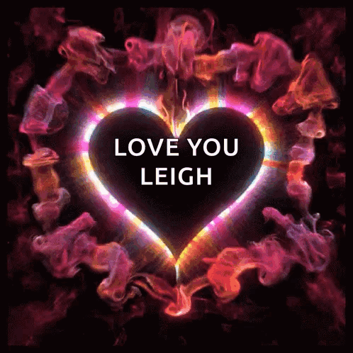 Colorful animated heart with 'LOVE YOU LEIGH' message, surrounded by glowing effects.