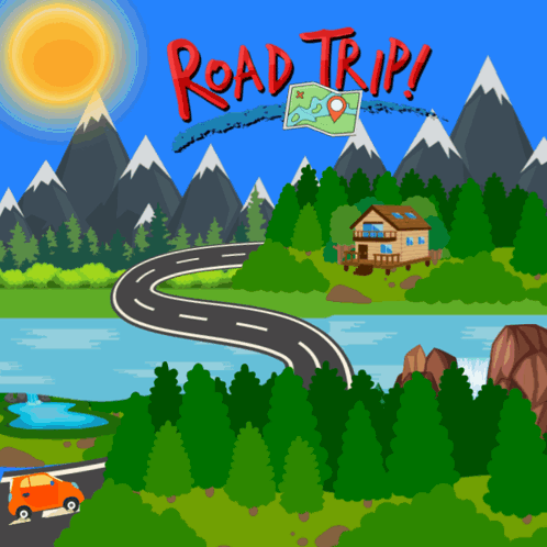 An animated scenic road trip through mountains, forests, and a lake, featuring a car driving on a winding road.