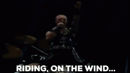 Rob Halford and K.K. Downing of Judas Priest performing 'Riding on the Wind' live on stage.