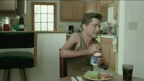 Rob Lowe, looking skinny, sits at a kitchen table opening a jar of mayonnaise next to a sandwich.