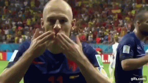 Dutch footballer Arjen Robben blows a hand kiss to the cheering crowd after a goal on the soccer field.