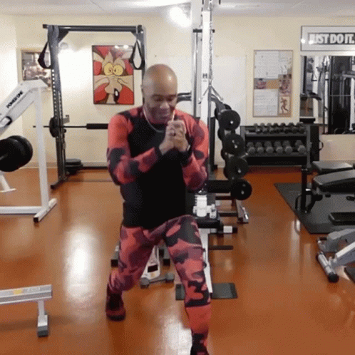 Robert E Blackmon performing lunges in a gym, demonstrating a workout routine for fitness goals.