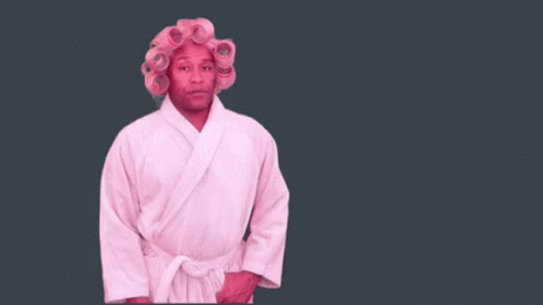 Roberteblackmon, dressed in a pink robe and hair rollers, answers a phone call with a sassy expression.