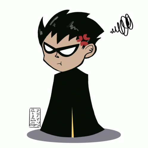 Chibi-style drawing of Robin (Dick Grayson) from DC Comics, looking angry with a red scowl and an angry swirl.