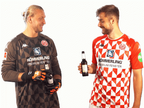 Mainz 05 players Robin Zentner and Alexander Hack share a celebratory beer toast.