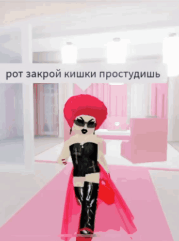 Roblox character in a drag-like outfit walks on a pink runway with a Russian caption.