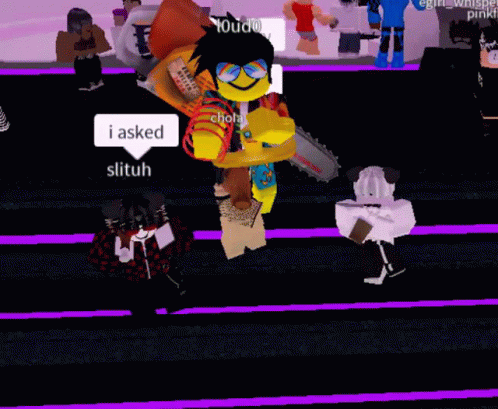 Roblox character 'chola' dances on a virtual floor as chat messages 'i asked', 'didnt ask', and 'datz crazy' appear.